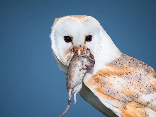 Barn owl, throughout its global distribution, feeds almost exclusively (95% -99%) on small mammals: mice, rodents, and rats. In fact, it demonstrates two important trends: It is a specialized predator: from all the existing food resources in an area where it lives, it will capture and consume only small mammals, and secondly it is a generalist predator within the group of small mammals, since it will focus on those species which are the most numerous. That proves that it is always the best natural regulator of harmful small mammals that demonstrate population outbreaks, as it focuses primarily on those with high population densities.